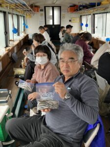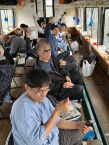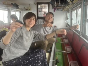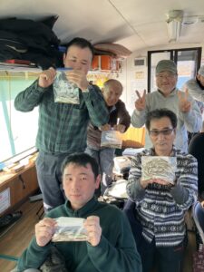 ・朝からポツポツと釣れ始めました。ほんとに小さな群れの回遊で底を中心で、誘っていればアタリがでるという面白い釣りになりました。初めてのお客様も50オーバーで多いに楽しめたようです。